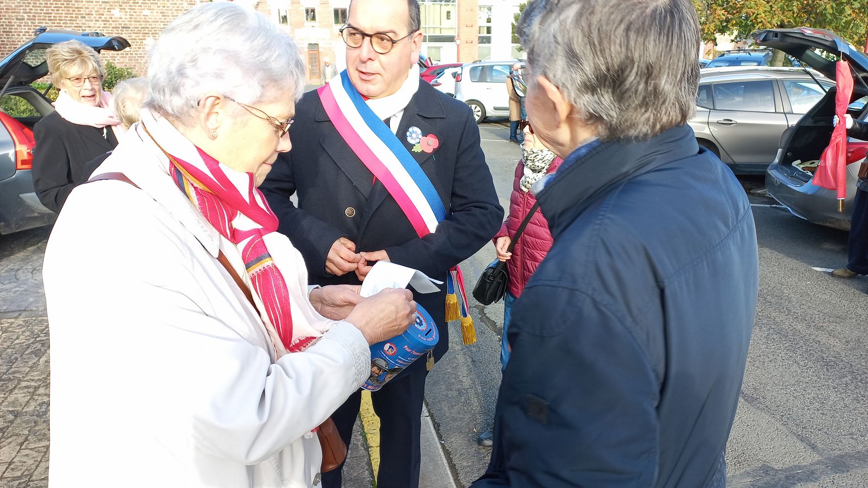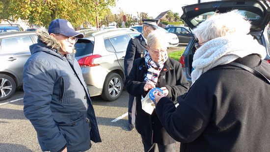 Madame Désirée Fauquenoy fait la quête pour le Bleuet de France.