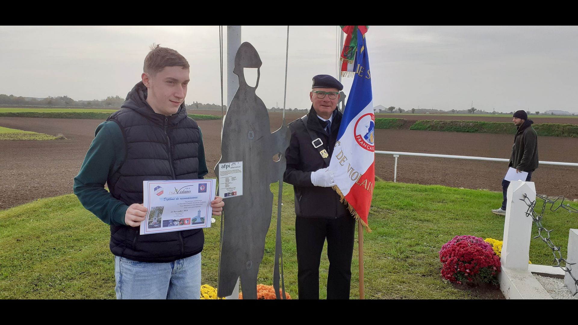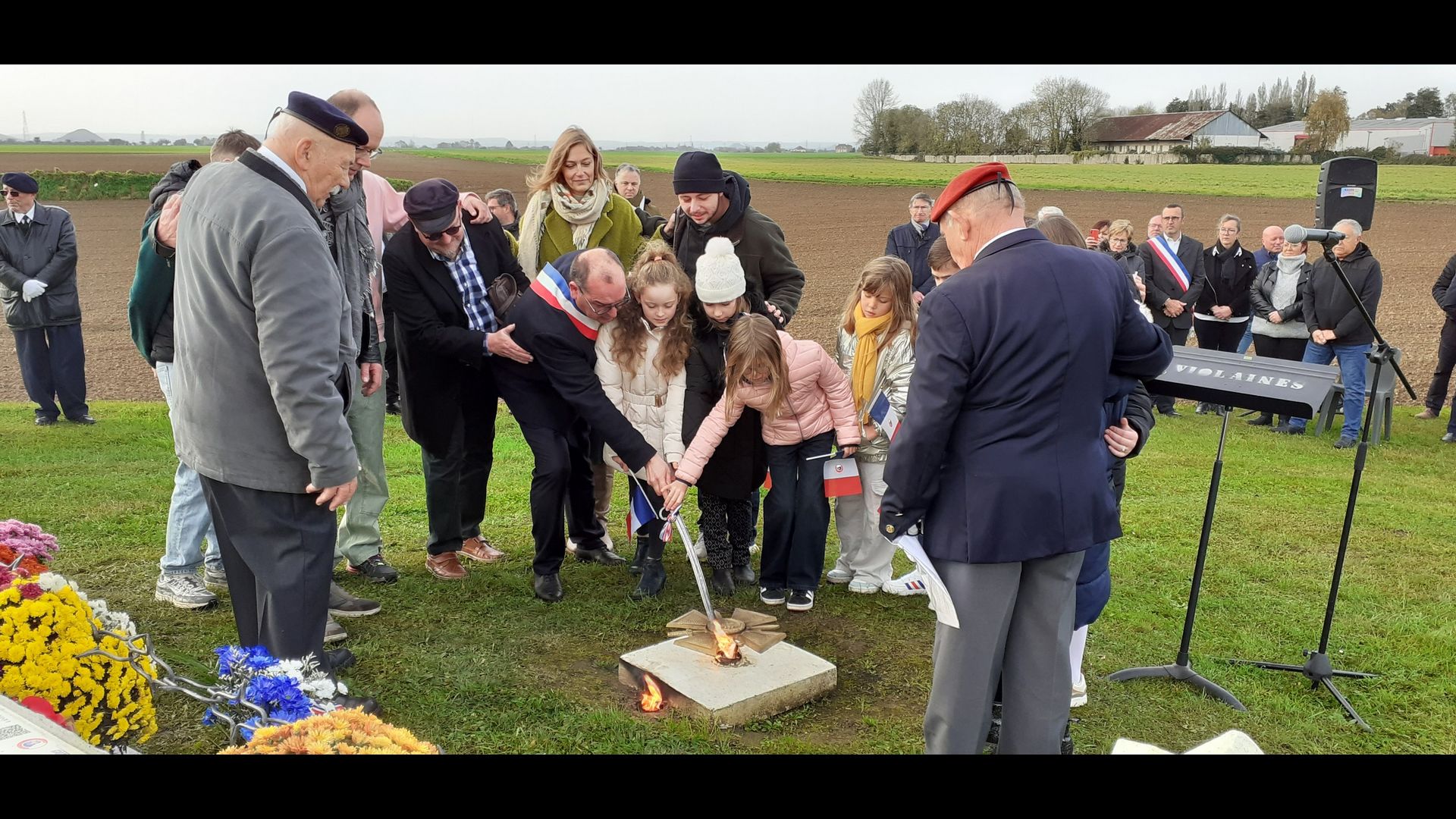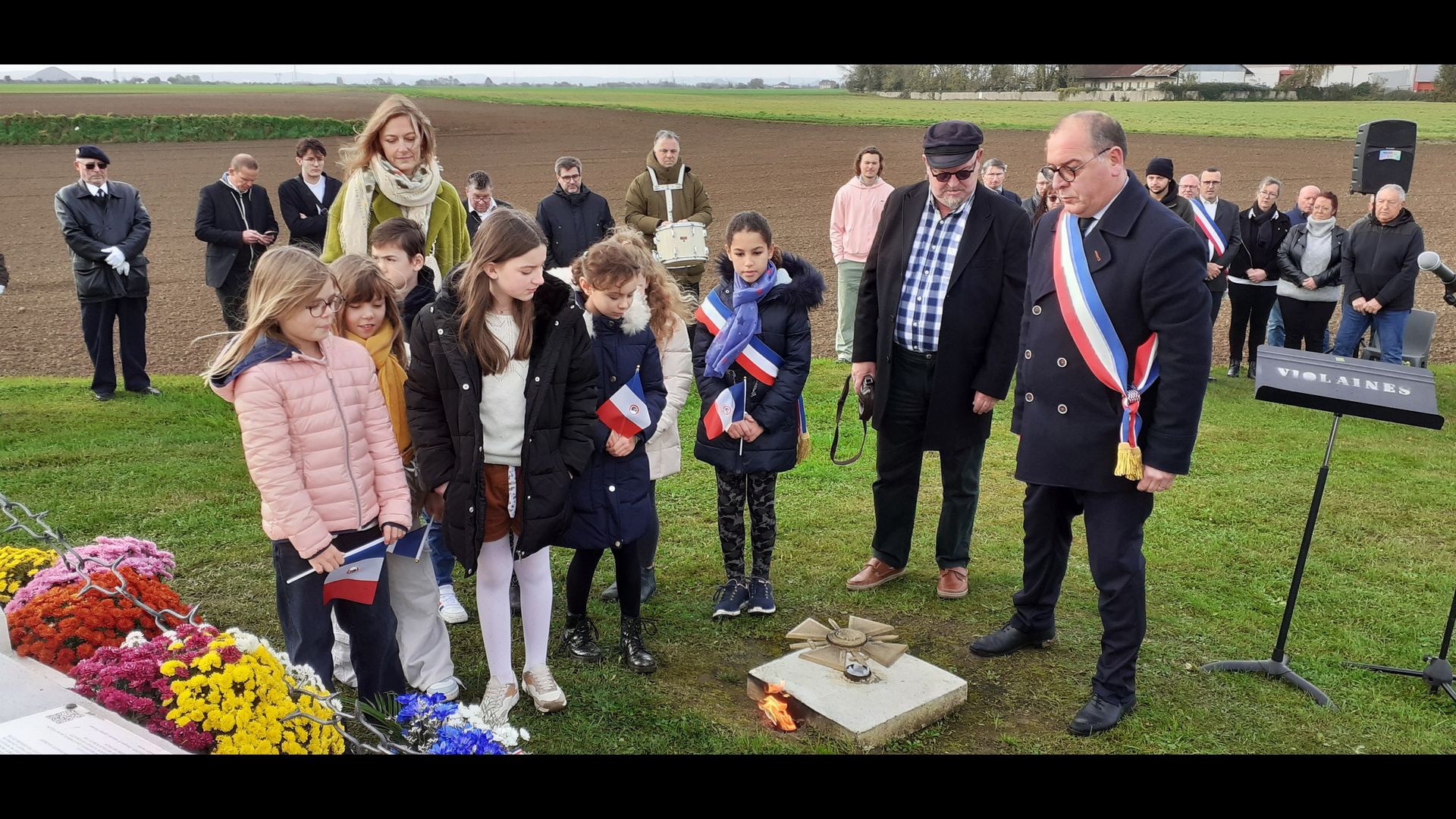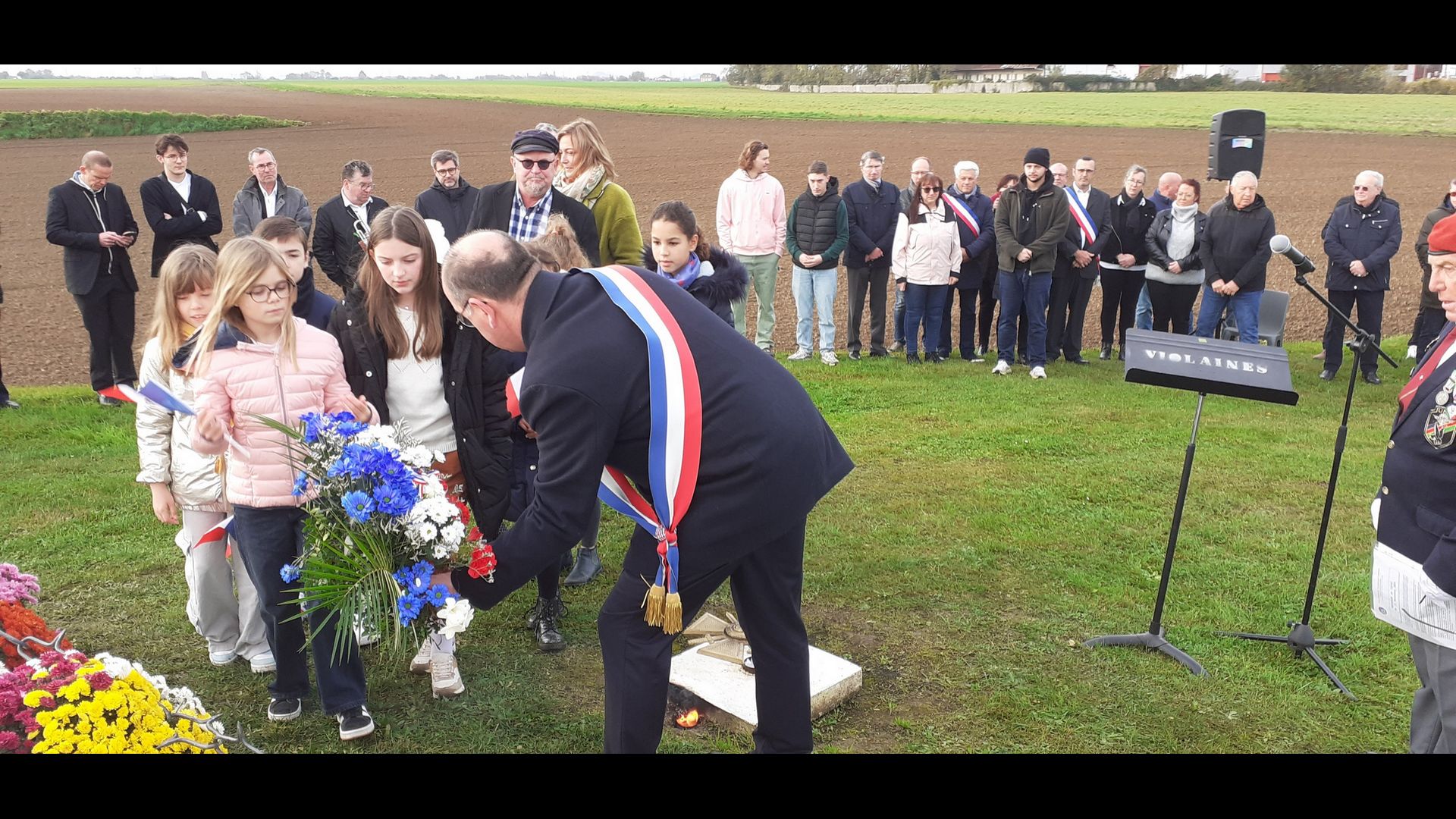 | Dépôt d’une gerbe de fleurs. Par Monsieur Jean-François Castell, Maire de Violaines, accompagné du CMJ de Violaines. |