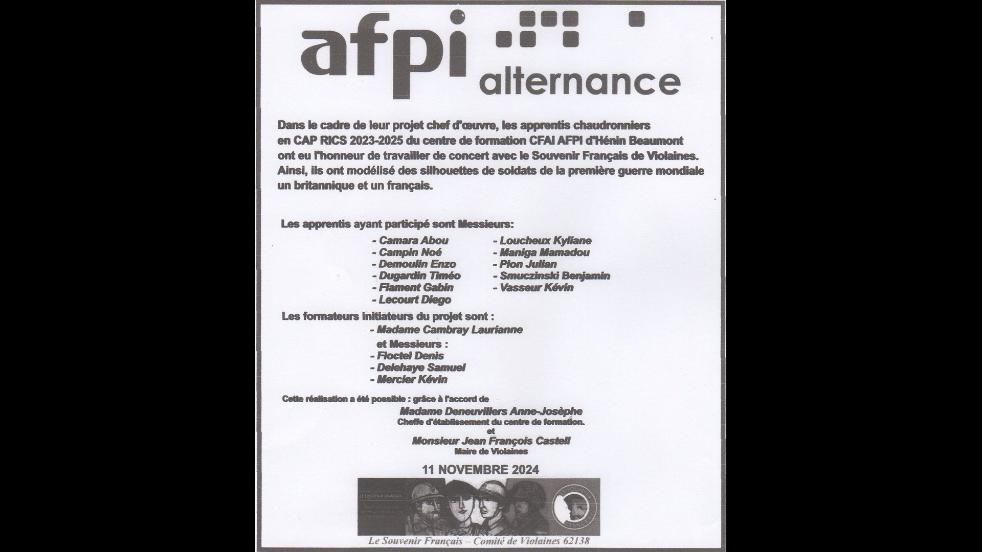| Discours de Monsieur Louis Fauquenoy Président du comité du souvenir Français de Violaines. Secrétaire des Anciens Combattants de Violaines. |